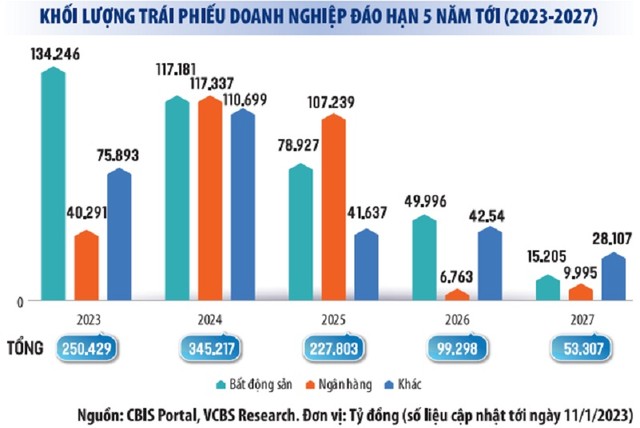 Theo dữ liệu của Hiệp hội Thị trường trái phiếu Việt Nam (VBMA), năm 2023, số lượng trái phiếu bất động sản đáo hạn rơi vào hơn 119.000 tỷ đồng. Trong khi áp lực đáo hạn trái phiếu là rất lớn, thì trái phiếu phát hành mới vẫn đóng băng (không có lô trái phiếu doanh nghiệp nào được phát hành trong 3 tuần đầu tháng 1/2023). Thêm vào đó, thị trường bất động sản các kênh huy động vốn (chứng khoán, tín dụng, huy động vốn từ người mua nhà…) đều khó khăn khiến doanh nghiệp phát hành khó tìm nguồn vốn đảo nợ.