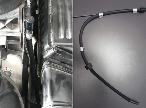 Ống nối lên khoang động cơ của một xe GLC làm ở xưởng dịch vụ bên ngoài (trái) và ống nối chính hãng (phải).