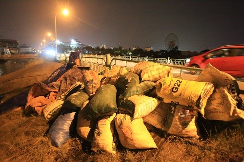 Khoảng 21h30 ngày 13/9, tại khu vực đường Nhật Chiêu thuộc phường Quảng An (Tây Hồ, Hà Nội), ba công nhân vẫn đang mải miết gom gần hai tấn cá chết vào các bao tải.