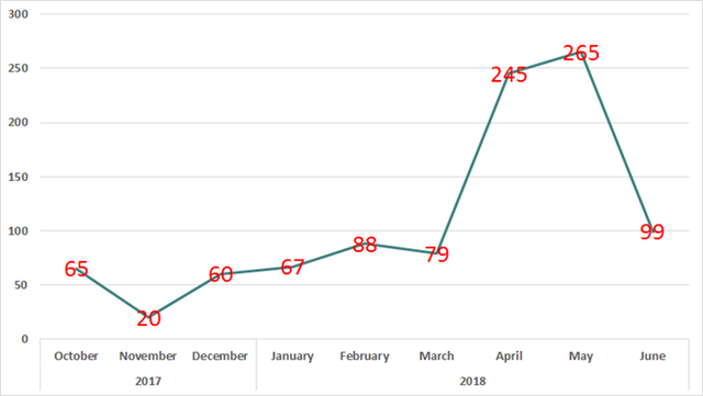 Số máy tính bị tấn công trong chiến dịch nhắm vào các tổ chức công nghiệp từ tháng 10/2017 tới tháng 6/2018. (Nguồn: Kaspeersky).