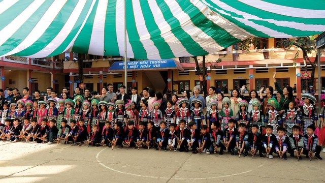 Rất nhiều người dân bản địa, trẻ con bé xíu, rồi toàn bộ các em học sinh của trường, các thầy cô giáo đã tập trung để đón chào chúng tôi. Một chương trình văn nghệ đặc sản vùng núi mà diễn viên là toàn bộ các em học sinh và các thầy cô đã khiến chúng tôi đi từ ngạc nhiên này đến ngạc nhiên khác. Không khí náo nức và cũng thật xúc động với màn chào cờ trang nghiêm. Rồi cảnh các em múa hát, thổi khèn, kéo chân chúng tôi bay xuống. Những ánh mắt hạnh phúc, vui vẻ của các bé khi nhận được quà. Thấy phòng ở bán trú khang trang rộng rãi, thư viện được trang trí rất đáng yêu với nhiều hình thù ngộ nghĩnh, chúng tôi vui lắm. Thầy chủ nhiệm lớp, các thầy cô và phụ huynh cũng thật vui vì lâu lắm rồi mới được tấm vé đi về tuổi thơ như vài bác chia sẻ.