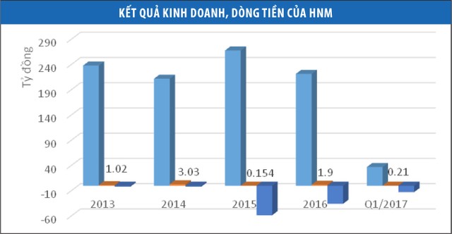 Hệ quả là nếu như trong năm 2015, vay nợ của HNM tăng không đáng kể nhờ nguồn tiền tăng vốn thành công trong đợt chào bán cuối năm 2014 giúp trang trải hoạt động, thì trong năm 2016, khi dòng tiền huy động đã hết, hầu như toàn bộ dòng tiền chi trả cho hoạt động kinh doanh và đầu tư phải trang trải bằng nợ vay, khiến vay nợ tăng mạnh 68,5 tỷ đồng. Kịch bản này cũng tiếp tục lặp lại trong quý I vừa qua.
