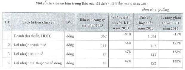 Cũng theo tài liệu này, doanh thu và lợi nhuận 2013 trước và sau kiểm toán có sự chênh lệch đáng kể.