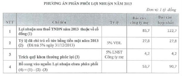 Nguồn vốn được sử dụng để phát hành cổ phiếu thưởng là lợi nhuận sau thuế tích lũy, thặng dư vốn, quỹ phát triển của công ty tính đến ngày 31/12/2013. Thời gian thực hiện dự kiến trong quý II/2014.