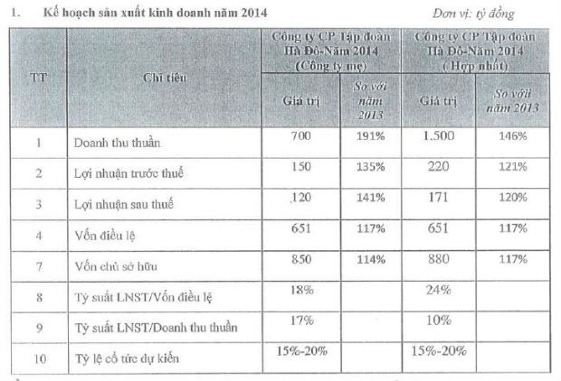 Năm 2014, HDG đặt mục tiêu doanh thu thuần Công ty mẹ và hợp nhất đạt lần lượt là 700 tỷ đồng và 1.500 tỷ đồng, tăng tương ứng 91% và 46% so với năm 2013. Lợi nhuận sau thuế Công ty mẹ và hợp nhất đạt lần lượt là 120 tỷ đồng và 171 tỷ đồng, tăng tương ứng 41% và 20% so với năm 2013. Mức cổ tức dự kiến là 15% - 20%.