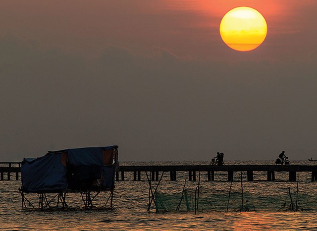 Còn khi hoàng hôn dần buông, Mặt Trời đỏ au ôm trọn từng đường nét thô sơ của biển. Hoàng hôn dịu dàng, thăm thẳm hiện ra. Bức tranh lúc tĩnh, lúc động hòa hợp vào nhau say mê đến lạ.