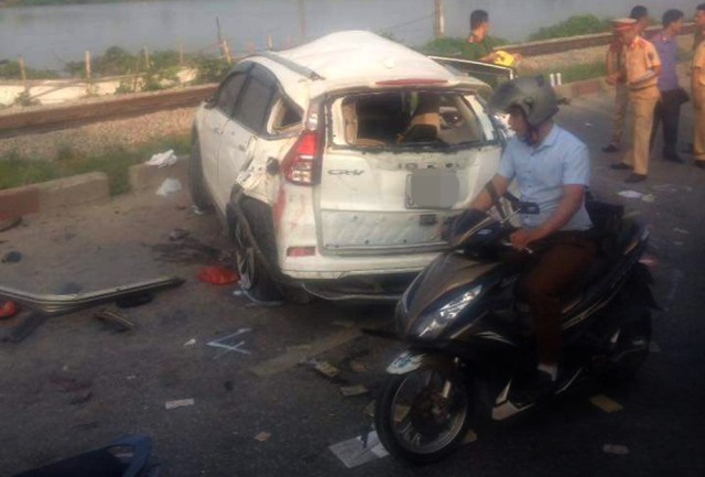 Sau cú va chạm mạnh với đoàn tàu chở khách, xe ôtô 5 chỗ văng xa cả chục mét, 4 nạn nhân rơi ra ngoài chết tại chỗ.