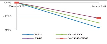 Chỉ riêng VF1 của VFM giảm 3,7% trong cùng khoảng thời gian, xấp xỉ mức giảm của VN-Index. Tuy nhiên, nếu tính tăng trưởng trong 4 tháng đầu năm, VF1 lại là quỹ tăng trưởng cao nhất với mức tăng lên đến 12% - cao gấp 3 lần tăng trưởng của VCBF-TBF và cao gần bằng mức tăng của VN-Index.