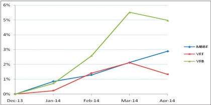 Trong khi đó, VFF của VinaWealth và VFB của VFM quay đầu giảm. Tuy nhiên, quỹ trái phiếu thường không phản ứng nhanh với thị trường như quỹ cổ phiếu, vì thế kết quả tăng trưởng nên được theo dõi theo quý. Tính đến cuối tháng 4, VFB tăng trưởng cao nhất với mức tăng 5%; VFF tăng thấp nhất với mức tăng chỉ 1,3%.
