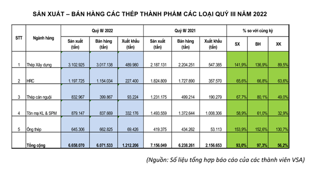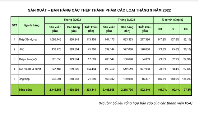 Tính chung 9 tháng đầu năm sản xuất tôn mạ kim loại và sơn phủ màu đạt 3,499 triệu tấn, giảm 19,7% so với cùng kỳ. Bán hàng đạt 3,238 triệu tấn, giảm 17,3% so với cùng kỳ năm trước, trong đó xuất khẩu đạt 1,654 triệu tấn, giảm 33,3% so với cùng kỳ năm 2021.
