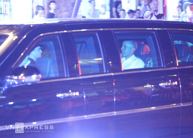 Hơn 20h ngày 23/5, Tổng thống Mỹ Obama xuất hiện tại phố Lê Văn Hưu (Hai Bà Trưng) để thưởng thức món bún chả Hà Nội. Trước đó nhiều giờ, quán ăn trên phố này có nhiều nhân viên an ninh nước ngoài lẫn Việt Nam kiểm tra nghiêm ngặt. Khách bước vào quán phải qua vài vòng an ninh. Khác với vẻ ngoài trang trọng khi tham dự các hoạt động chính thức, Tổng thống Mỹ mặc sơ mi trắng, tươi cười với người dân khi bước vào quán. Ảnh: Giang Huy.