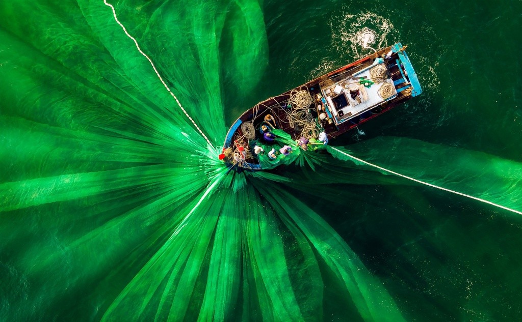 Tác phẩm "Đánh cá" của nhiếp ảnh gia Alex Cao đã lưu lại khoảnh khắc tuyệt diệu của biển cả và con người. Bức ảnh được chụp tại vùng biển Quảng Ngãi trong một buổi sớm mai. Dưới ống kính trên cao, tay săn ảnh bắt được tạo hình lưới vây xanh độc đáo cùng nét đẹp lao động của ngư dân xứ biển miền Trung. Chia sẻ với Agora, Alex Cao cho biết: "Vào thời điểm này, nước rất trong và thuyền đang giăng được mẻ lưới đầy ăp cá cơm".