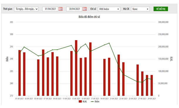 Thị trường cổ phiếu niêm yết Sở GDCK Hà Nội (HNX) tháng 4 tiếp tục có diễn biến giao dịch khá ổn định. Tại ngày giao dịch cuối cùng của tháng, chỉ số HNX Index đạt 281,75 điểm, giảm 1,7% so với cuối tháng trước.