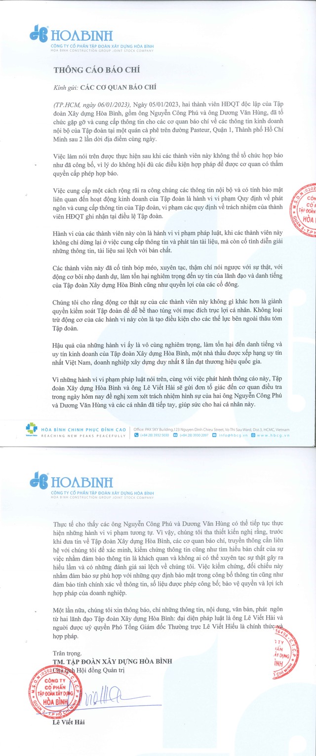Ngày 05/01/2023, hai thành viên HĐQT độc lập của Tập đoàn Xây dựng Hòa Bình, gồm ông Nguyễn Công Phú và ông Dương Văn Hùng, đã tổ chức gặp gỡ và cung cấp thông tin cho các cơ quan báo chí về các thông tin kinh doanh nội bộ của Tập đoàn tại một quán cà phê trên đường Pasteur, quận 1, Thành phố Hồ Chí Minh sau 2 lần dời địa điểm cùng ngày.