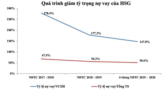 Tỷ lệ nợ vay/vốn chủ sở hữu tương ứng giảm từ mức rất cao 278,4% xuống còn 147%,. Tỷ lệ nợ vay/tổng tài sản giảm từ 67,5% về mức 50,6%.