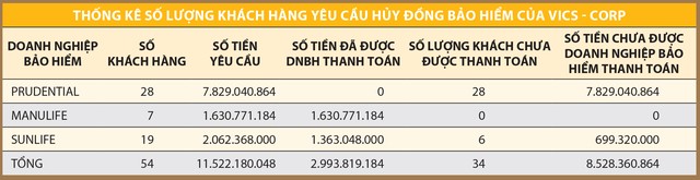 Công ty cổ phần Tư vấn dịch vụ bảo hiểm Việt Nam (VICS - CORP) cho biết, thời gian qua, Công ty nhận được yêu cầu hỗ trợ từ hàng chục người tham gia bảo hiểm nhân thọ của Manulife, Prudential, Sun Life, BIDV Metlife… yêu cầu hủy đồng bảo hiểm và hoàn lại tiền phí, đến nay có gần một nửa số người yêu cầu đã được công ty bảo hiểm thanh toán.