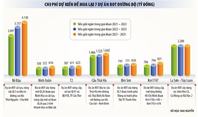 Ngoài dự án trên, danh sách 6 dự án BOT còn lại được Bộ GTVT đề xuất hoàn trả chi phí gồm: Dự án BOT cải tạo nâng cấp Quốc lộ 3 và đường cao tốc Thái Nguyên - Chợ Mới; Dự án BOT xây dựng mới Quốc lộ 26 qua Ninh Hòa và nâng cấp một số đoạn Quốc lộ 26 qua Khánh Hòa, Đắk Lắk; Dự án BOT nâng cấp Quốc lộ 91 và 91B tại Cần Thơ; Dự án BOT cầu Thái Hà nối 2 tỉnh Thái Bình, Hà Nam với đường cao tốc Cầu Giẽ - Ninh Bình; Dự án BOT nâng cấp, mở rộng đường Hồ Chí Minh đoạn km 1.738 - km 1.736; Dự án BOT xây dựng các hầm Đèo Cả, Cù Mông và Hải Vân 2 (không được thu phí tại trạm La Sơn - Túy Loan như phương án tài chính).