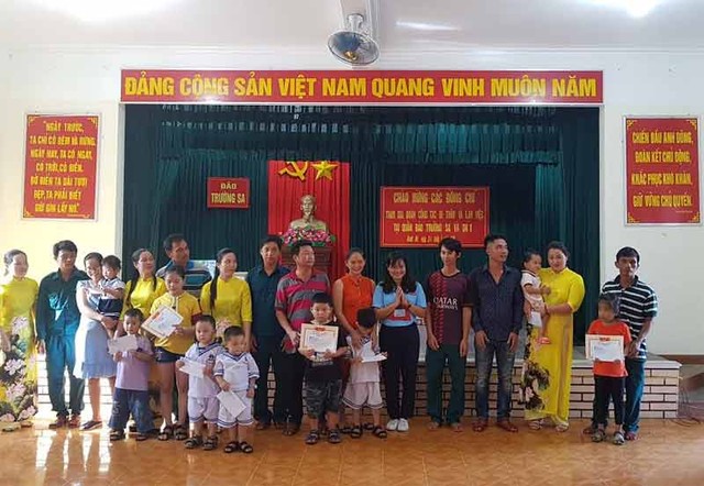 Nhà báo Lê Thanh Hà, đại diện Báo Đầu tư (áo xanh, giữa) đã trao tặng các suất học bổng của Giải golf từ thiện thường niên Vì trẻ em Việt Nam - Swing for the Kids cho các học sinh trên đảo Trường Sa, cũng như con em của các cán bộ kiểm ngư, các chiến sĩ hải quân đang làm nhiệm vụ quanh khu vực quần đảo Trường Sa.