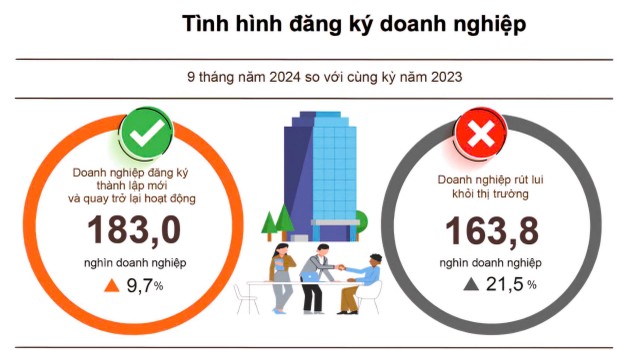 Bên cạnh đó, cả nước có hơn 61.100 doanh nghiệp quay trở lại hoạt động (tăng 25% so với cùng kỳ năm 2023), nâng tổng số doanh nghiệp thành lập mới và quay trở lại hoạt động trong chín tháng năm 2024 lên hơn 183.000 doanh nghiệp, tăng 9,7% so với cùng kỳ năm 2023. Bình quân một tháng có hơn 20.300 doanh nghiệp thành lập mới và quay trở lại hoạt động.
