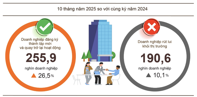 Cùng thời gian, có 11.600 doanh nghiệp quay trở lại hoạt động, tăng 7,9% so với tháng 9 và tăng 33,9% so với cùng kỳ năm 2024.