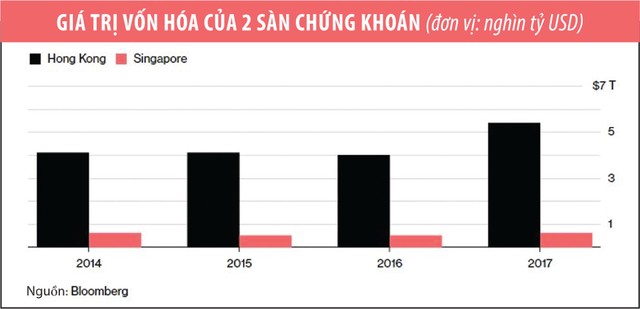 Xét về giá trị thị trường, được trợ lực từ sự hiện diện của các công ty Trung Quốc khổng lồ bao gồm Tencent Holdings Ltd và China Construction Bank Corp, Hồng Kông đang nắm giữ vị trí thị trường chứng khoán lớn thứ tư thế giới. Trong khi đó, kích cỡ của thị trường Singapore khá khiêm tốn, dù đang là thị trường chứng khoán lớn nhất Đông Nam Á.