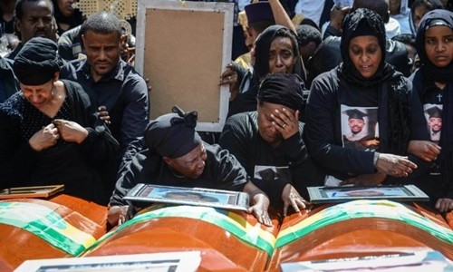 Người thân các nạn nhân vụ rơi máy bay Ethiopian Airlines khóc bên những chiếc quan tài rỗng phủ quốc kỳ trong lễ tang tập thể ởAddis Ababa ngày 17/3. Ảnh:AFP.