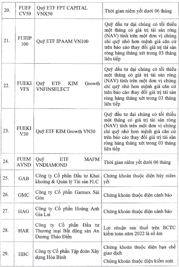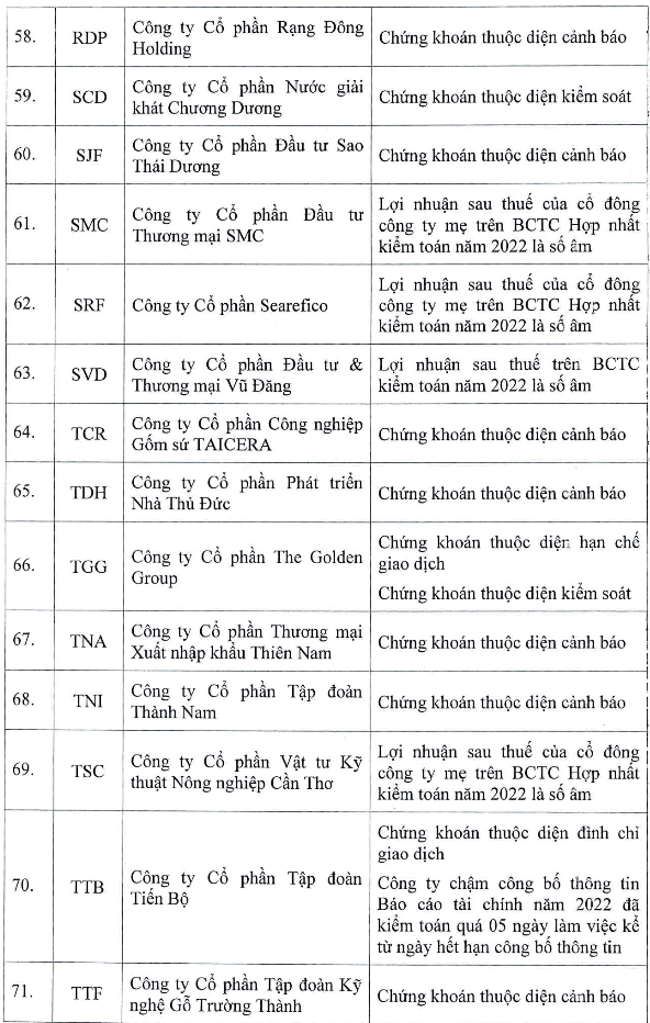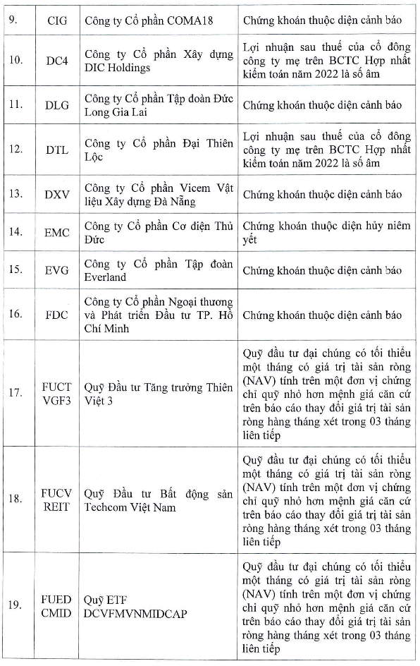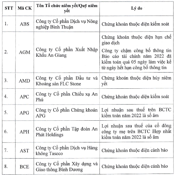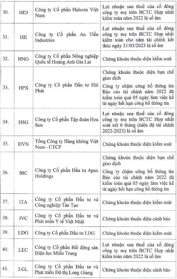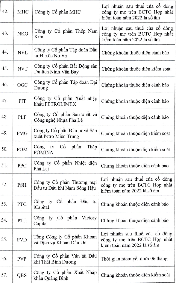 Một số cổ phiếu thép được HOSE liệt kê như: HSG của CTCP Tập đoàn Hoa Sen do lợi nhuận sau thuế của cổ đông công ty mẹ trên BCTC Hợp nhất soát xét 6 tháng (niên độ tài chính 2022- 2023) là số âm. Lý do cũng tương tự đối với NKG, DTL. TTB thuộc diện đình chỉ giao dịch và Công ty chậm công bố thông tin BCTC năm 2022 đã kiểm toán quá 5 ngày làm việc kể từ ngày hết hạn công bố thông tin.
