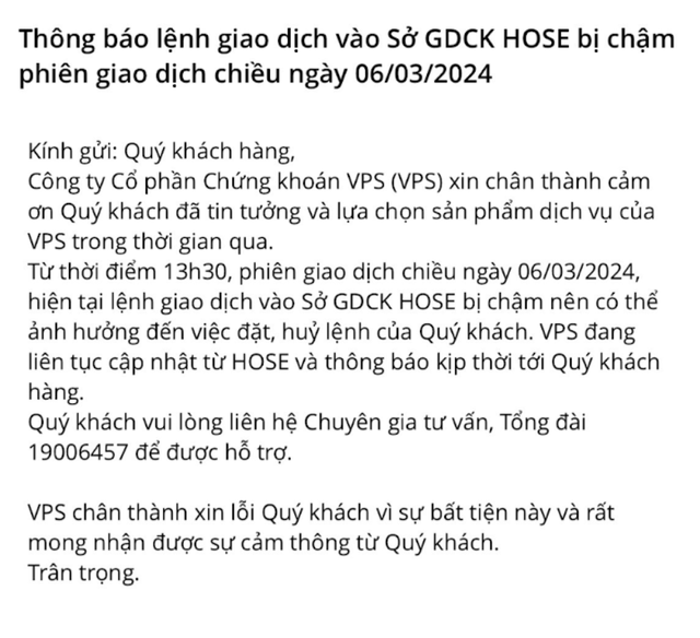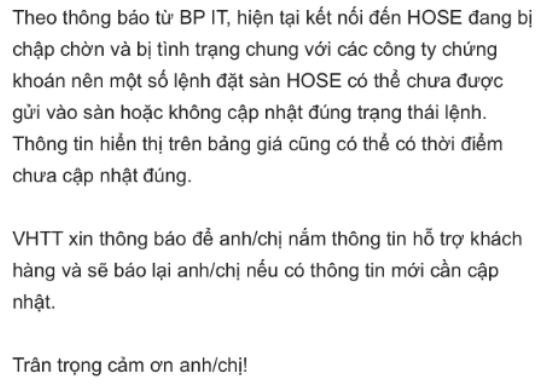 CTCP VPS thông báo tới khách hàng, lệnh vào HOSE bị chậm nên có thể ảnh hưởng đến việc đặt, hủy lệnh của khách hàng. VPS đang liên tục cập nhật từ HOSE và sẽ thông báo tới khách hàng.