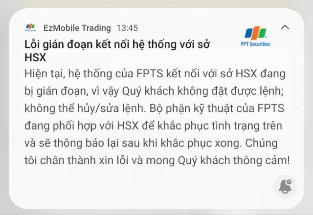 CTCK FPT cũng thông báo kết nối với HOSE bị gián đoạn, nhà đầu tư không đặt được lệnh, không thể hủy/sửa lệnh. Bộ phận kỹ thuật của FPTS đang phối hợp với HOSE để khắc phục tình trạng trên.