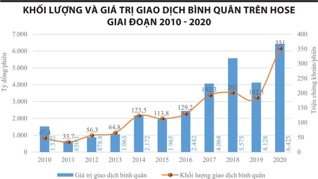Cụ thể, khối lượng giao dịch bình quân ngày của năm 2020 đạt gần 351 triệu chứng khoán, giá trị giao dịch bình quân ngày đạt trên 6.425 tỷ đồng, tăng lần lượt 92,66% và 55,65% so với năm 2019.