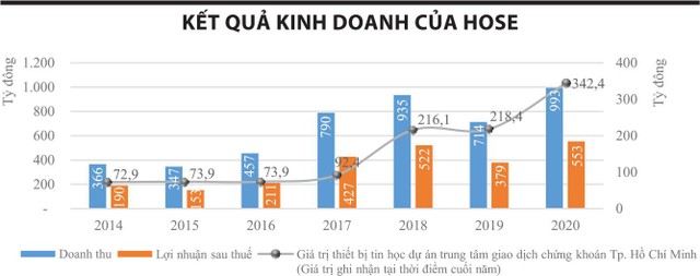 Theo báo cáo tài chính của HOSE, năm 2020, Sở đạt 992,88 tỷ đồng doanh thu, tăng 39% so với năm 2019. Động lực tăng trưởng tập trung chủ yếu trong nửa cuối năm 2020 với khoảng 611 tỷ đồng doanh thu, tăng 58% so với 6 tháng cuối năm 2019 (nửa đầu năm 2020 đạt 382 tỷ đồng doanh thu, tăng 17% so với cùng kỳ).