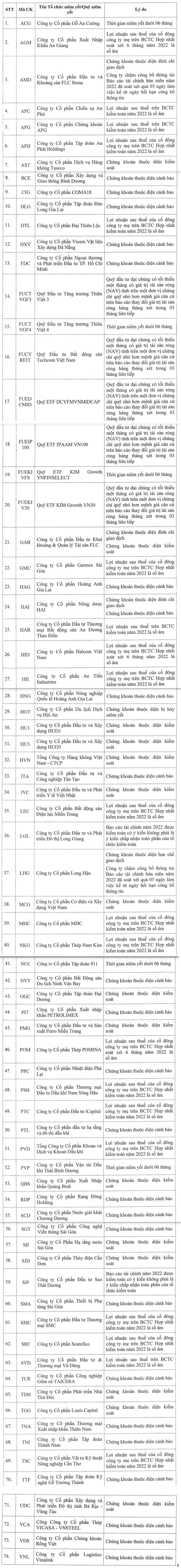 Dưới đây là danh sách 74 doanh nghiệp không đủ điều kiện cấp margin trong quý II/2023: