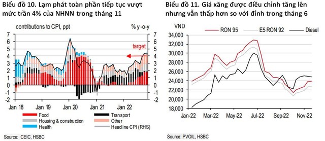 Bên cạnh những rủi ro ảnh hưởng đến tăng trưởng ngày một gia tăng, lạm phát gia tăng cũng là một vấn đề cần lưu tâm. Như dự báo, lạm phát tiếp tục vượt mức trần 4% của Ngân hàng Nhà nước Việt Nam (NHNN). Lạm phát toàn phần trong tháng 11 tăng 0,4% so với tháng trước, tương đương mức 4,4% so với cùng kỳ năm trước (Biểu đồ 10). Cụ thể, lạm phát cơ bản gần đạt mức 5% so với cùng kỳ năm trước, cho thấy sự phục hồi nhanh chóng của nhu cầu trong nước. Mặc dù vậy, khác với các nước láng giềng trong khu vực, Việt Nam đang phải đối mặt với tình trạng thiếu năng lượng, tạo áp lực tăng lạm phát toàn phần.