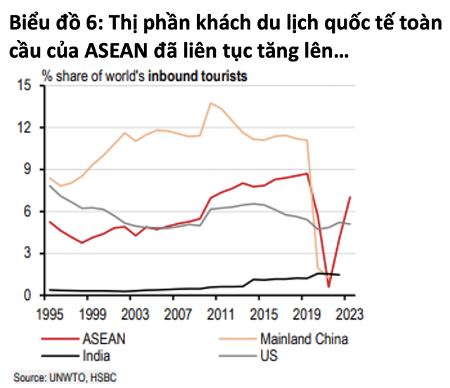 Trở ngại lớn nhất đối với ASEAN, theo HSBC chính là làm sao để gia tăng giá trị cộng thêm cho du lịch. Các lựa chọn bao gồm đầu tư vào du lịch xa xỉ, mở rộng nền ẩm thực hoặc tổ chức các sự kiện siêu lớn và chương trình biểu diễn âm nhạc. Thị phần doanh thu du lịch toàn cầu của ASEAN cũng tăng trong giai đoạn từ 2007 đến 2019. Tuy nhiên, nếu so sánh thị phần lượt khách toàn cầu và thị phần doanh thu du lịch toàn cầu của ASEAN, cả hai chỉ số đều tăng với tốc độ như nhau.