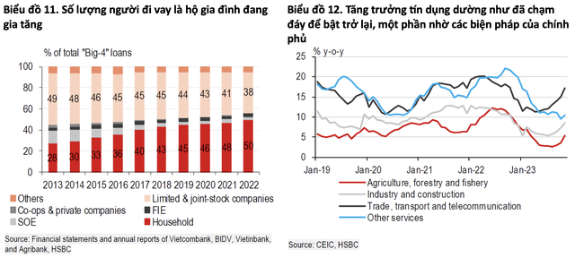 HSBC cho biết, mặc dù tiềm năng có vẻ sáng sủa nhưng cần lưu ý những rủi ro liên quan và vấn đề chính cần lưu tâm là nợ của hộ gia đình gia tăng. Mặc dù không có dữ liệu để đo lường ở Việt Nam, HSBC đã ước tính thông qua phân tích báo cáo tài chính của bốn ngân hàng lớn, vốn có thể bao gồm những khoản vay cho hộ kinh doanh nhỏ lẻ. Trong giai đoạn 2013-2022, nợ của hộ gia đình tăng mạnh, từ 28% GDP lên 50% GDP. Đòn bẩy tiêu dùng gia tăng không bền vững có thể tạo ra những rủi ro đáng kể cho ngành ngân hàng Việt Nam, cũng như ảnh hưởng đến chi tiêu tiêu dùng trong tương lai do phải cắt thêm thu nhập để trả nợ.