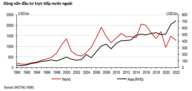 Báo cáo của HSBC cũng cho biết, dòng vốn đầu tư trực tiếp từ nước ngoài vào các nước trên thế giới đã sụt giảm một thời gian sau khi đạt đỉnh vào năm 2015 như một phần của xu hướng “đảo ngược toàn cầu hóa” và “phân mảnh địa kinh tế”.