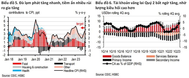 Nhìn chung, HSBC đánh giá, nền kinh tế Việt Nam đã nhìn thấy một số tín hiệu phục hồi vốn đang rất cần thiết, đặc biệt là trong lĩnh vực thương mại và du lịch. HSBC duy trì dự báo tăng trưởng năm 2023 ở mức 5,0%, kỳ vọng một sự phục hồi mạnh mẽ trong Quý 4. Tuy nhiên, rủi ro lạm phát đã xuất hiện trở lại. Xét tình hình tỷ giá USD-VND mạnh lên, HSBC đã loại bỏ dự đoán trước đó về đợt cắt giảm lãi suất cuối cùng 50 điểm cơ bản.