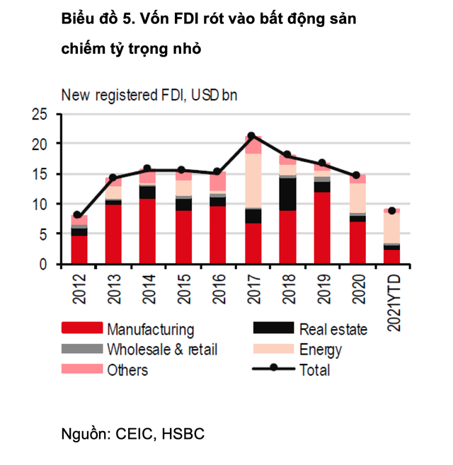 Các số liệu FDI cho thấy mặc dù dòng vốn FDI mới rót vào ngành bất động sản tăng hơn 200% vào tháng 5 so với cùng kỳ năm ngoái, nhưng phần lớn vẫn chủ yếu tập trung vào lĩnh vực sản xuất (Biểu đồ 5). Điều đó cho thấy giá tăng chủ yếu do nhà đầu tư trong nước.