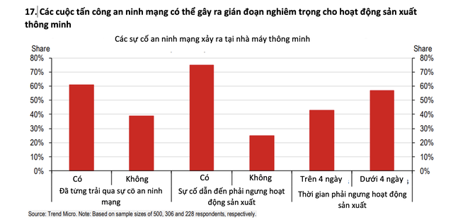Thực tế, một khảo sát của Trend Micro năm 2020 cho thấy trên 60% nhà sản xuất (ở Mỹ, Đức và Nhật Bản) từng gặp sự cố an ninh mạng xảy ra trong nhà máy thông minh, ba phần tư trong số đó trải qua tình trạng ngưng trệ hoạt động sản xuất vì những sự cố như vậy (Biểu đồ 17).
