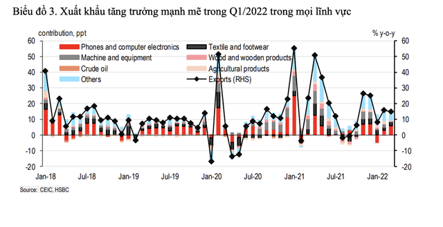 Thực tế, kết quả tích cực cũng phần nào được thể hiện ở động lực tăng trưởng bên ngoài đã mạnh mẽ trở lại. Xuất khẩu tháng 3 tăng trưởng gần 15% so với cùng kỳ năm trước, kéo tăng trưởng quý I/2022 lên gần 13% so với cùng kỳ năm trước.
