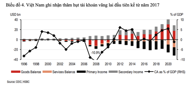 Tuy nhiên, tốc độ phục hồi có khả năng sẽ chậm. HSBC cho rằng, trước tác động do giá dầu thế giới tăng cao, dự báo Việt Nam sẽ có thêm một năm thâm hụt tài khoản vãng lai trong năm 2022 mặc dù mức độ thâm hụt cũng khiêm tốn, chỉ khoảng 0,2% GDP.