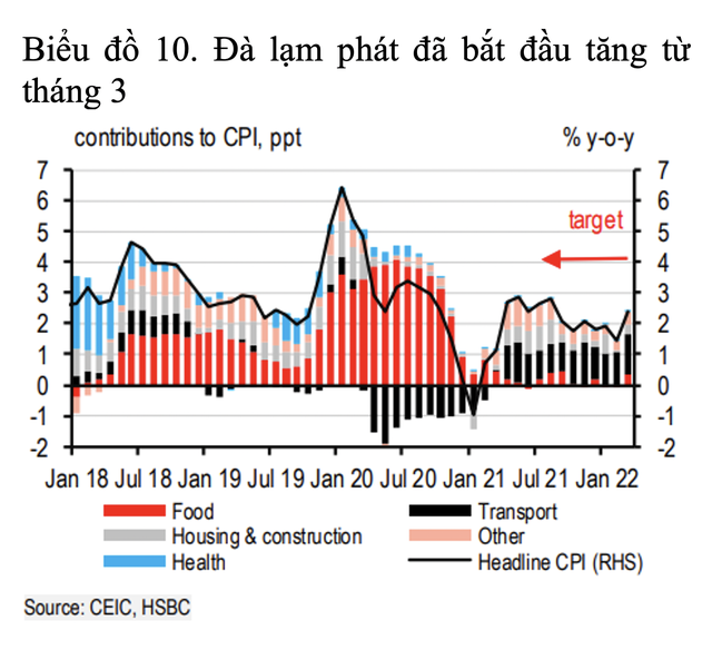 Trước tình hình giá dầu thế giới tăng cao, HSBC dự báo xu hướng sẽ còn kéo dài một thời gian nữa, tạo áp lực khiến lạm phát gia tăng. Vì vậy, gần đây HSBC đã điều chỉnh dự báo lạm phát lên 3,7% trong năm 2022, vẫn dưới mức mục tiêu 4% của Ngân hàng Nhà nước.