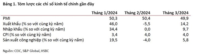 Theo Báo cáo, mặc dù các chỉ số cao tần đáng khích lệ, Việt Nam đã khởi đầu năm 2024 với kết quả GDP hơi thấp hơn kỳ vọng. Tăng trưởng GDP quý I/2024 của Việt Nam đạt mức 5,66% so với cùng kỳ năm trước, thấp hơn mức dự báo của HSBC và thị trường là 6,4% so với cùng kỳ. Mặc dù vậy, điều này không có nghĩa là sự phục hồi bị ảnh hưởng, nhưng câu chuyện phục hồi diễn ra không đồng đều.