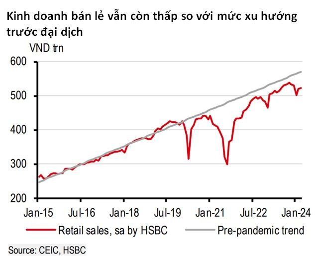 “Trong khi đó, tăng trưởng kinh doanh bán lẻ chưa trở lại mức xu hướng trước đại dịch, so với xu hướng này thì vẫn còn hụt đáng kể khoảng 10%. Mặc dù chu kỳ xuất khẩu của Việt Nam đã bắt đầu nhìn thấy tín hiệu phục hồi nhưng vẫn chưa đủ để chuyển hóa thành một cú hích đáng kể cho các lĩnh vực trong nước”, Báo cáo nhận định.