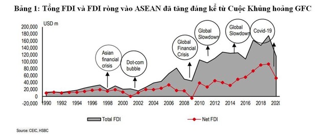 Theo HSBC, tỷ trọng đầu tư vào các nước ASEAN-6 so với FDI toàn cầu là minh chứng rõ rệt cho xu hướng này. Trong khi Cuộc Khủng hoảng Tài chính châu Á (AFC) ban đầu gây ra những tác hại đối với môi trường đầu tư ASEAN, sau GFC, FDI đổ vào khu vực này ngày càng nhiều hơn. FDI vẫn đứng vững kể từ khi dịch bệnh bắt đầu. Thực tế, năm 2020, ASEAN-6 thu hút lượng FDI cao kỷ lục, khoảng 13% FDI toàn thế giới, phần lớn nhờ vào sự bùng nổ đầu tư vào Singapore.