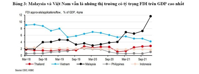 HSBC chỉ rõ, nếu nhìn vào dữ liệu tần suất cao, Malaysia và Việt Nam là hai thị trường nổi bật. Trong khi giá trị FDI được phê duyệt trong quý IV/2021 của Malaysia vọt lên chiếm 12% GDP, Việt Nam đã chuyển đổi thành công thành trung tâm sản xuất mới nổi của toàn cầu.