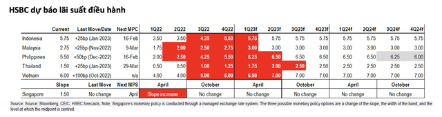 Trong khi đó, Ngân hàng Trung ương Philippines (Bangko Sentral ng Pilipinas - BSP) sẽ tăng lãi suất lên mức cao thêm 250 điểm cơ bản so với mức trước đại dịch, điều đó sẽ ảnh hưởng tới hoạt động vay và tiêu dùng nói chung”, HSBC nhận định.
