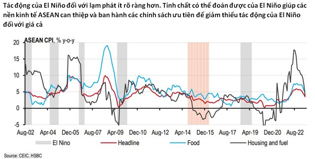 Theo Báo cáo, lĩnh vực nông nghiệp của ASEAN chịu ảnh hưởng trực tiếp nhất từ El Niño. Khi nhiều quốc gia đã tiến lên trong chuỗi giá trị, quy mô tuyệt đối của ngành nông nghiệp trở nên nhỏ bé, chiếm khoảng 10% GDP ở mỗi quốc gia. Tuy nhiên, theo quan điểm của HSBC, không thể đánh giá thấp tầm quan trọng của nông nghiệp.
