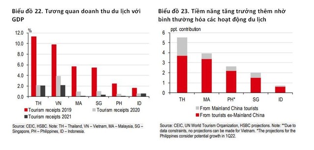 “Không may là xuất khẩu dịch vụ, đặc biệt là du lịch, đã sụt giảm nghiêm trọng trong đại dịch. Tuy nhiên, trong bối cảnh nhiều nơi trên thế giới mở cửa biên giới cho phép đi lại, chúng ta có thể kỳ vọng du lịch ASEAN sẽ phục hồi đúng vào lúc cần nhất. Sự phục hồi này có thể sẽ không trọn vẹn nhưng có thể đem lại chút bền bỉ để giúp ASEAN vượt qua những sóng gió trên phạm vi toàn cầu”, HSBC nhận định.