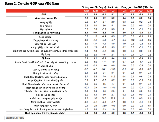 Theo HSBC, phải mất thêm một thời gian nữa mới trở lại được như thời trước đại dịch là vận tải và dịch vụ lưu trú sụt giảm 7% và 30% so với năm 2019, trở thành hai nhóm ngành làm chậm tốc độ tăng trưởng của nền kinh tế. Mặc dù vậy, năm 2022 có thể mang đến niềm hy vọng mới cho hai ngành này khi Việt Nam mở lại đường bay thương mại đến 8 thị trường chính từ 1/1/2022 sau hai năm tạm ngưng.
